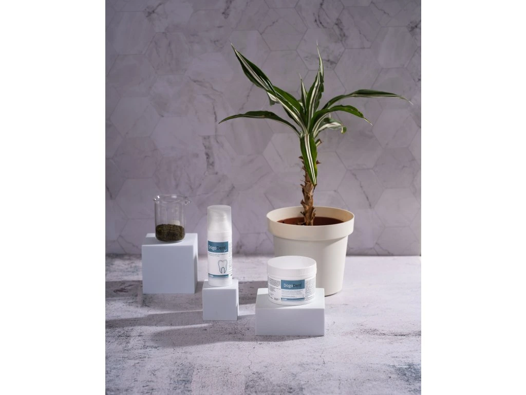DogoDent® Dental Box je kombinace dvou produktů pro každodenní péči o ústní dutinu psa – sypké směsi pro vnitřní užití a gelu pro lokální aplikaci.