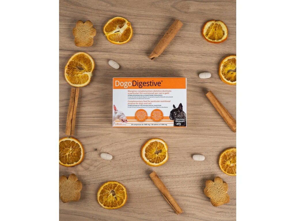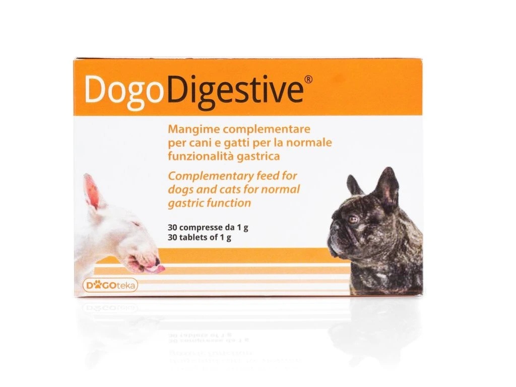 DogoDigestive® je doplňkové krmivo ve formě tablet, určené pro psy a kočky s trávicími obtížemi, jako je průjem, nadýmání, koliky nebo nechutenství.