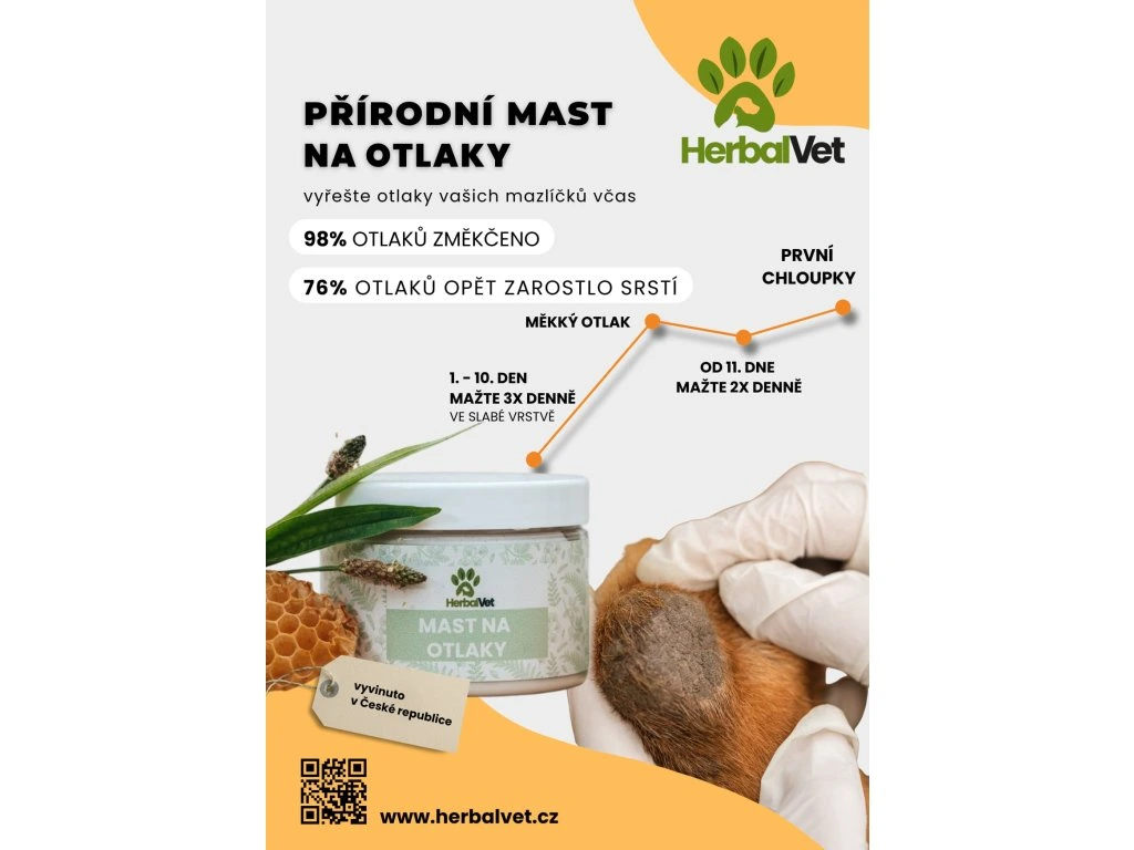 HerbalVet® Mast na otlaky je přírodní mast určená pro pravidelnou péči o pokožku psa, zejména v oblasti loktů, hlezen a dalších tlakových míst. Otlaky vznikají nejčastěji dlouhodobým tlakem na tvrdém povrchu a mohou se postupně měnit ve ztvrdlou, suchou nebo praskající kůži.